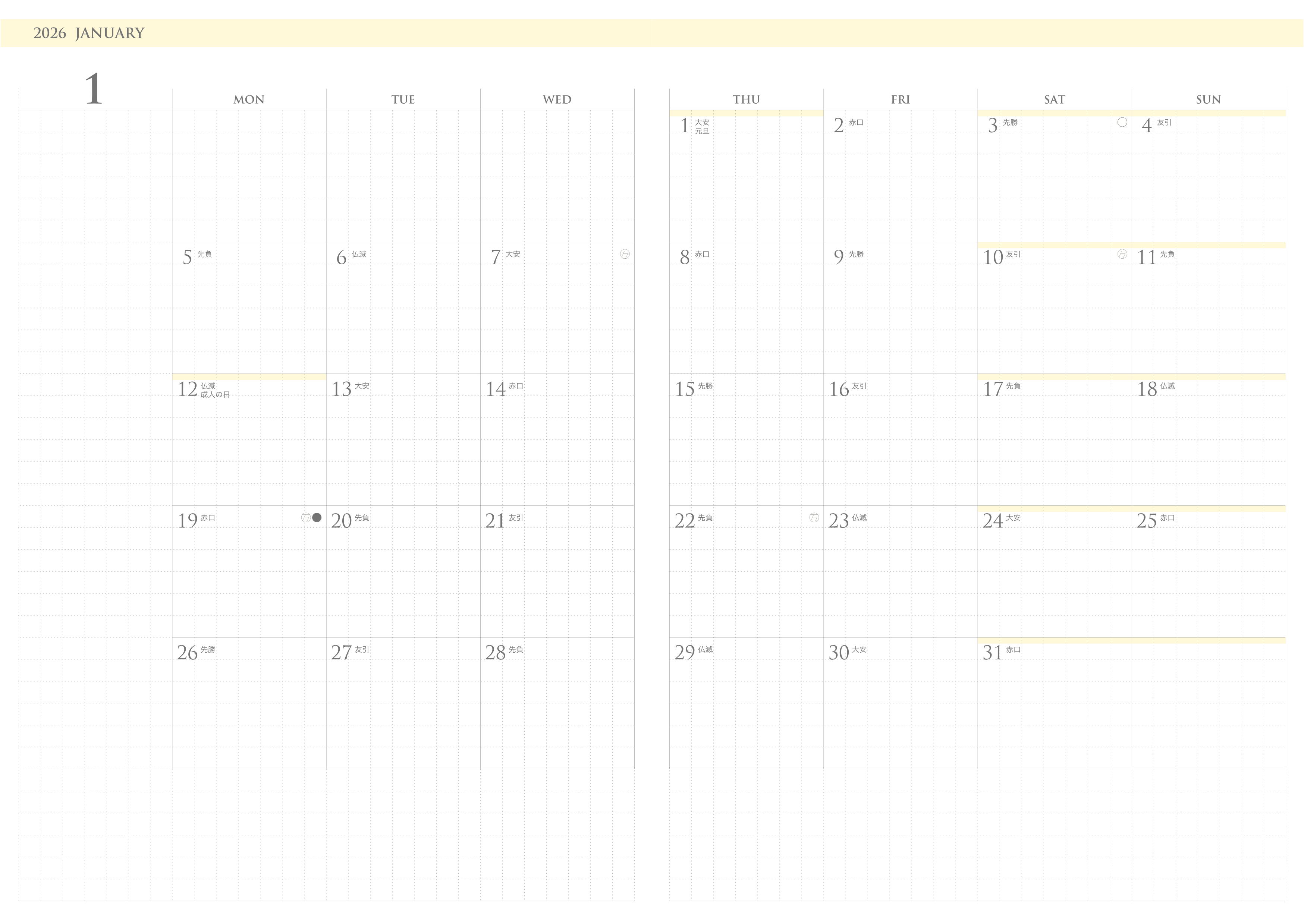 ・ブロック式カレンダー(1月始まり・月曜始まり)